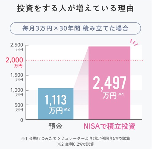 「銀行に預けているから安心」と思っていても、実は預金とNISAで積立投資をした場合では、30年後に1,000万円以上も差が出る!