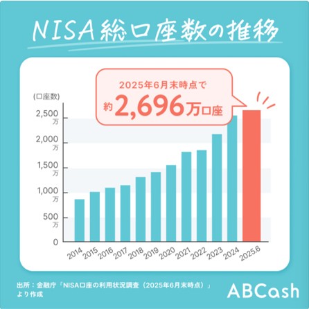 2024年1月から新NISAが始まったこともあって、NISAの総口座数は約2,696万口座を突破!(※2025年6月末時点)