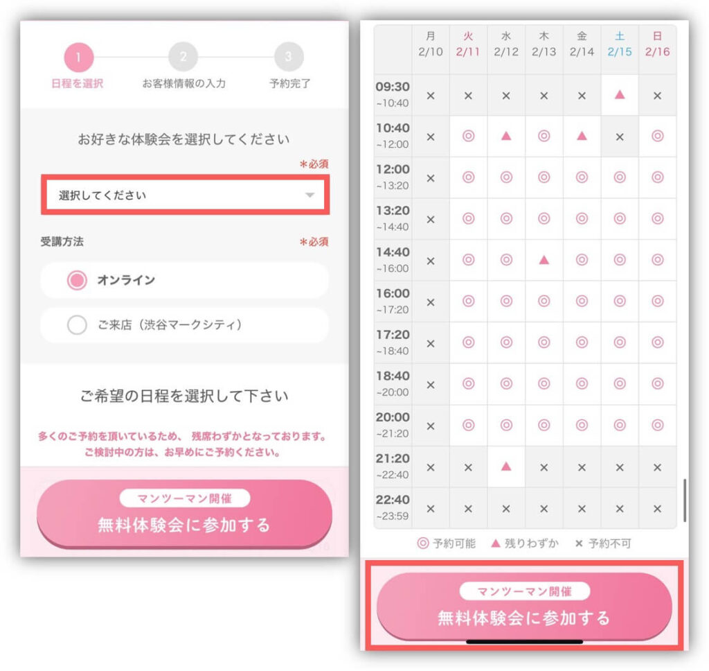 次に希望の日時を選択して「無料体験会に参加する」をタップしよう😊