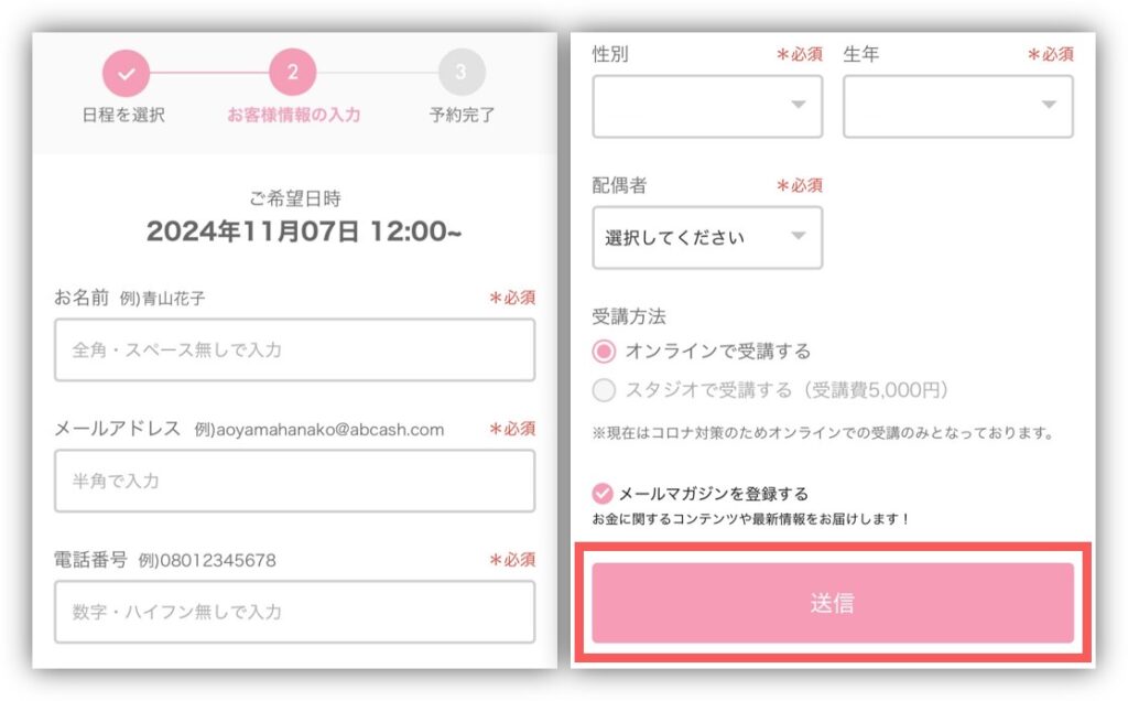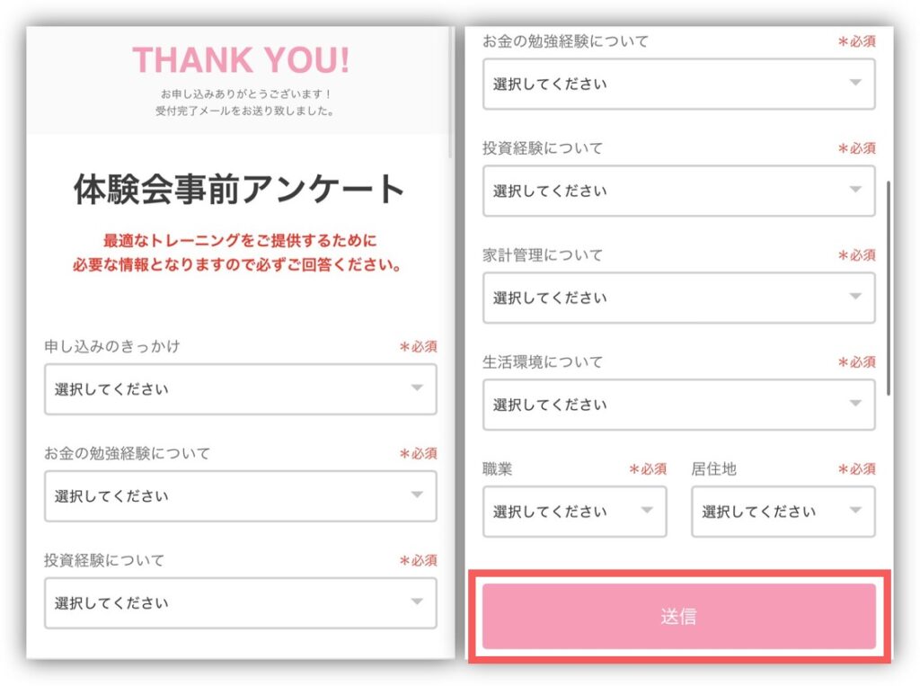 送信が完了したら、体験会事前アンケートの画面が表示されるから、すべての質問に答えてね🙏