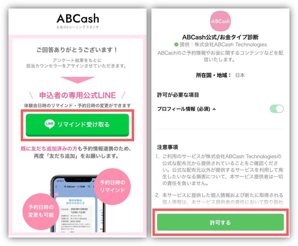 「リマインドを受け取る」→「許可する」の順にタップして、ABCashを友達に追加してね!