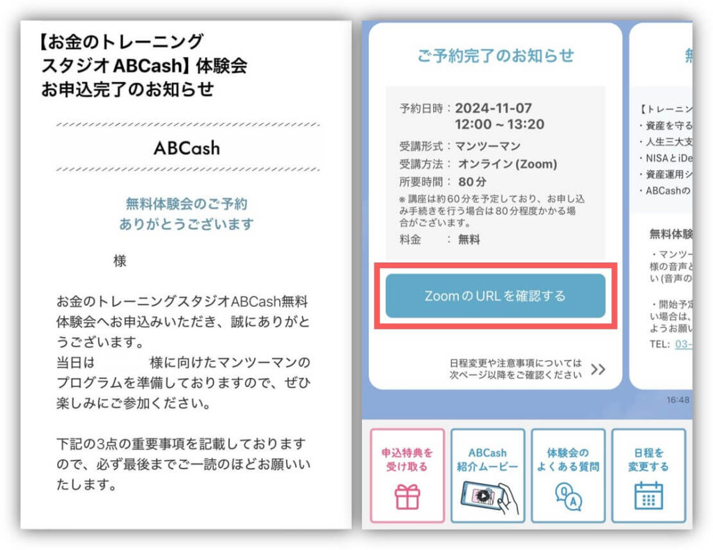 体験当日は、公式LINEに送られてきたメッセージの「ZoomのURLを確認する」から無料体験に参加できるよ🫶