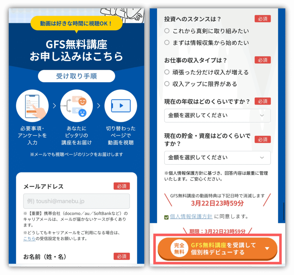 すべての入力が終わったら、もう一度「GFS無料講座を受講して個別株デビューする」をタップ🫶