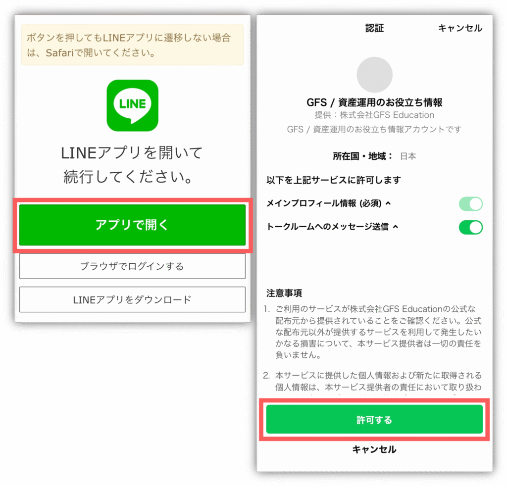 タップするとLINEアプリが開くから、「アプリで開く」→「許可する」をタップ💡