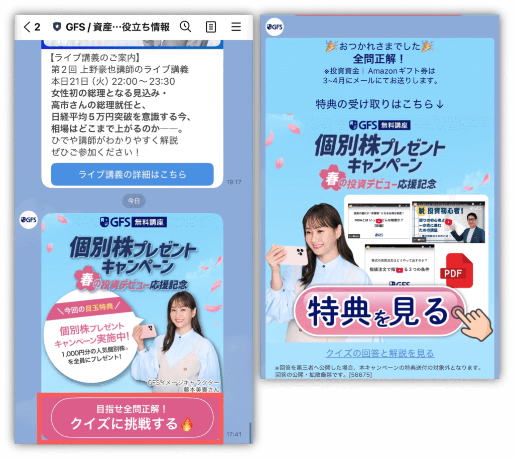 GFS無料講座(旧バフェッサ)の本編動画を最後まで視聴し、その後のクイズもしくはアンケートに答えると、特典動画がもらえるよ😍