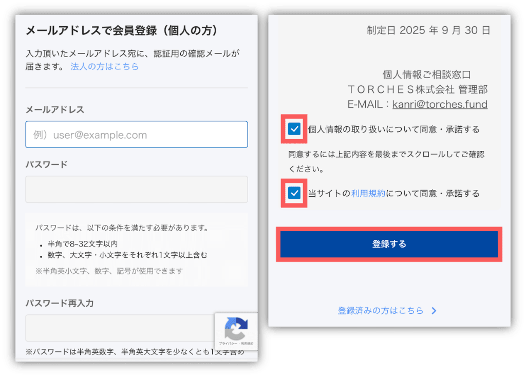 個人情報の取り扱いや利用規約にチェックを入れたら「登録する」をタップして、仮登録に進もう💨