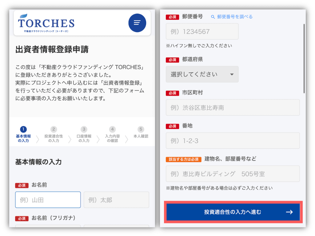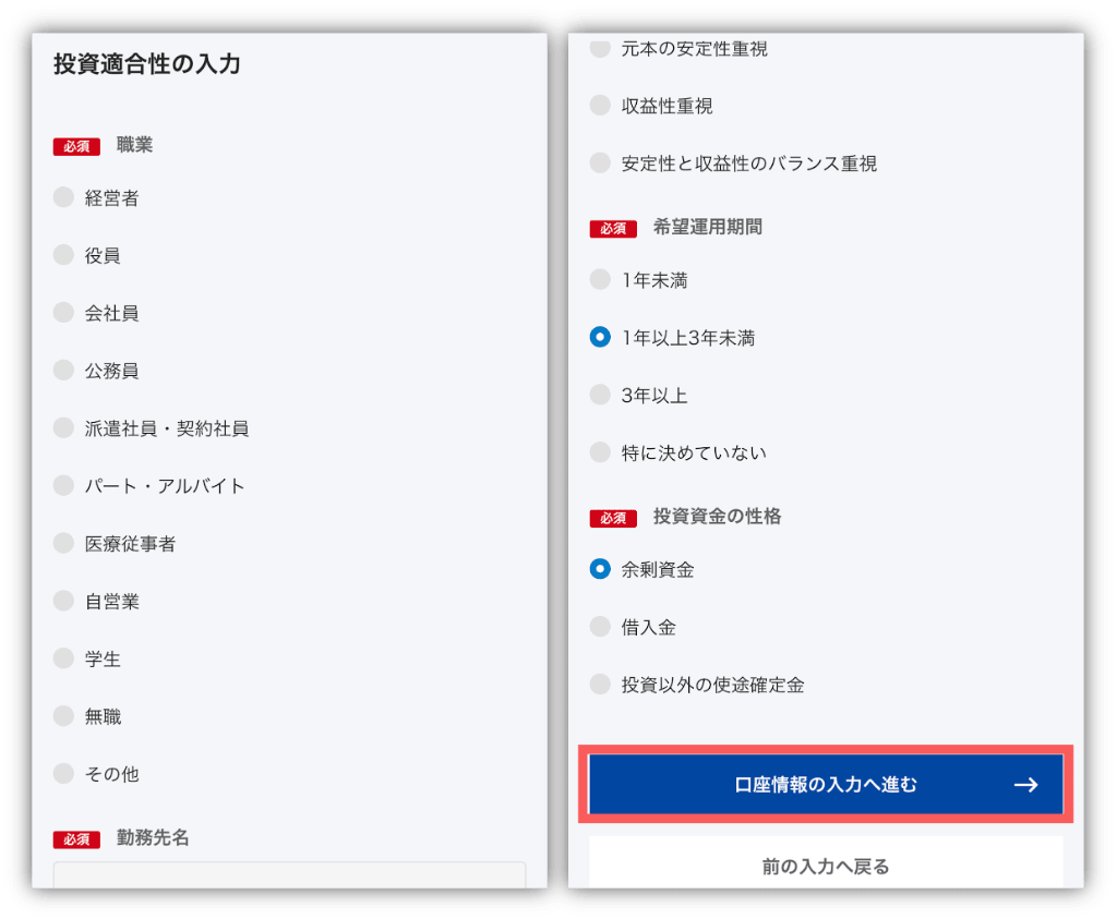 名前や住所などを入力したら、ページの下にある「投資適合性の入力へ進む」をタップ🥰
