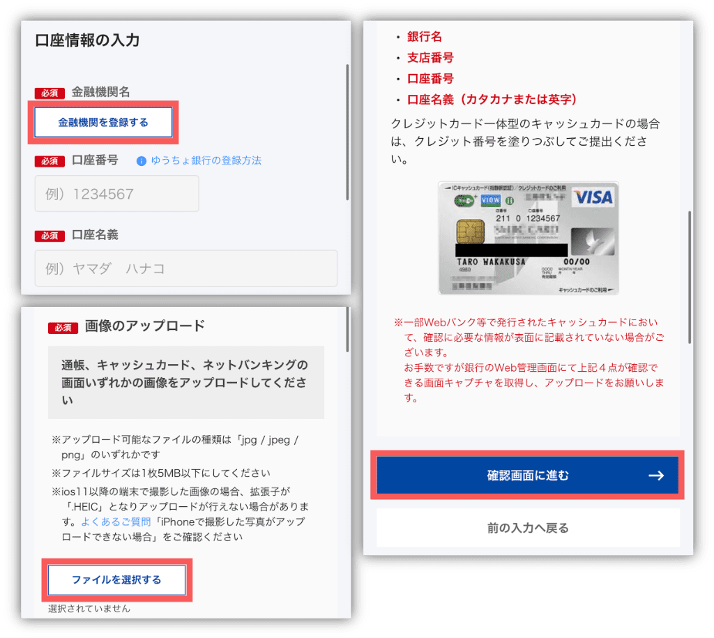次に「ファイルを選択する」から、案内のとおり口座情報が確認できるものを撮影し、アップロードしてね🙇