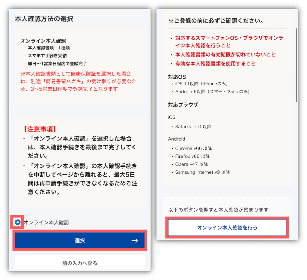 「オンライン本人確認」にチェックを付けて、「選択」をタップ💨